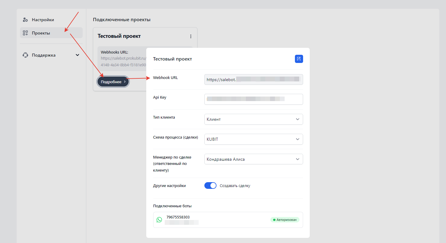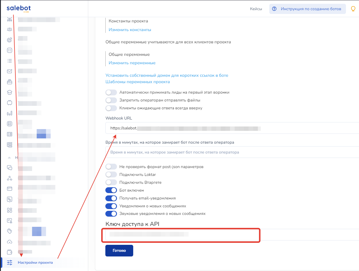 В первую очередь нас интересует Webhook URL - его нужно скопировать и в личном кабинете Salebot на вкладке настроек вставить в одноименное поле