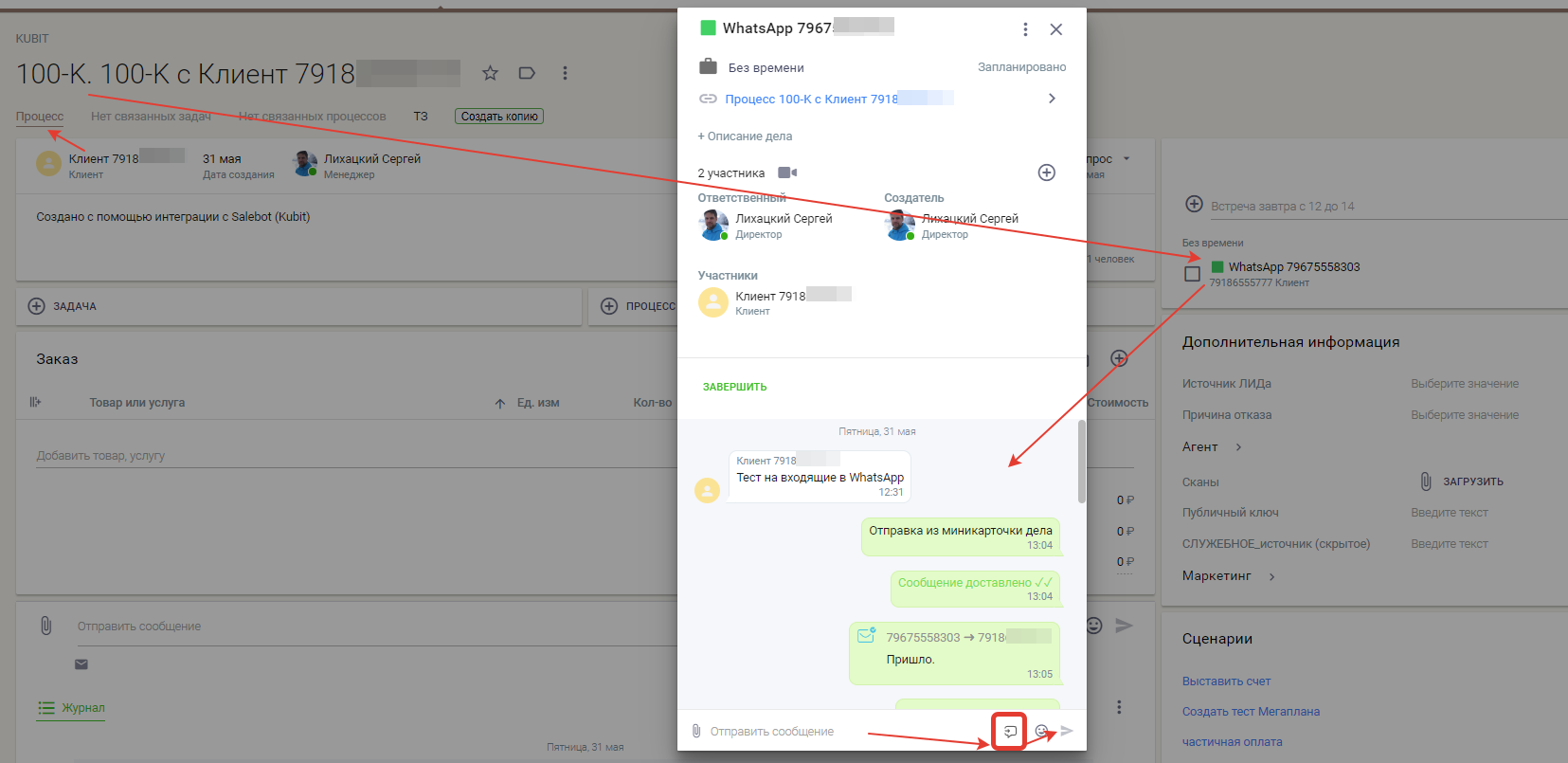 Также, создается дело (коммуникация), которая привязывается и к клиенту и к процессу (сделке, при условии что создание не отключено в настройках).