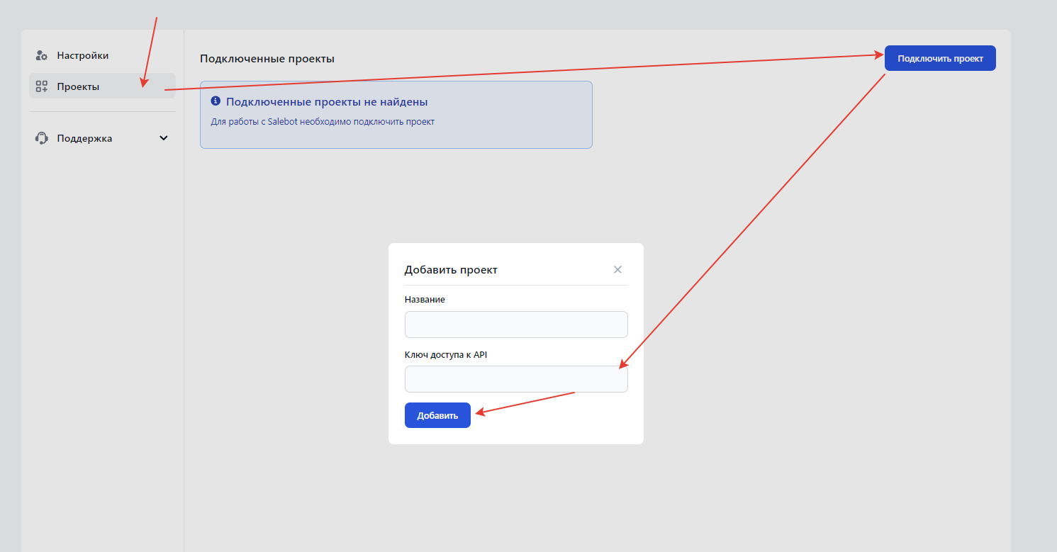 Переходим на вкладку “Проекты”, Подключить проект